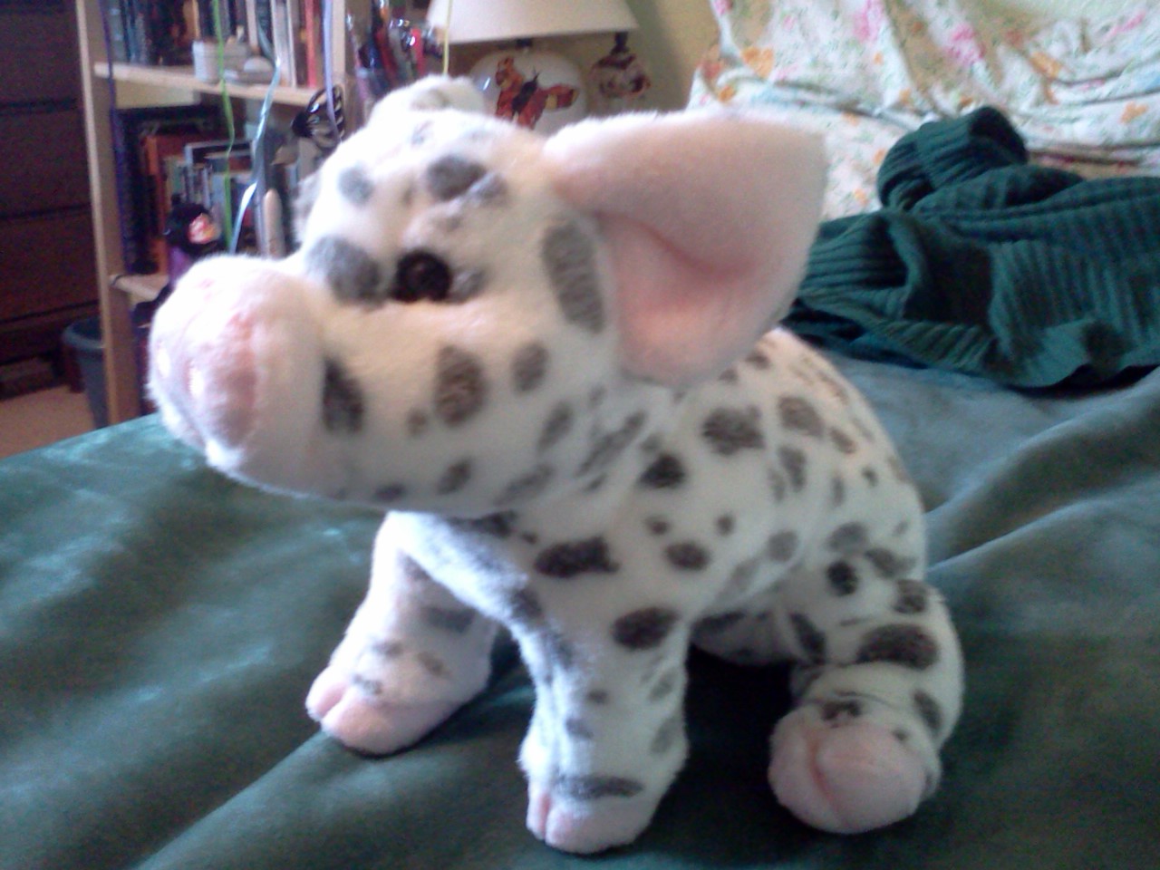 I named him Cloven Snowsnout, and not without purpose. Look at his hooves. He’s got cloven hooves. How often does a toy manufacturer go out of their way to make sure a pigs’ feet cleaves apart? This little darling could be used as an educational aid when explaining Jewish dietary restrictions. I was very impressed with that. His last name comes from the fact that he looks kind of like a snow leopard. There aren’t pigs out there in the real world like this. Google image “spotted pig.” The majority of the results will be some ritzy restaurant in New York. Even the images you get of actual white-and-black-spotted creatures will show you that pigs simply don’t have so many distinct little spots. He looks like a snow leopard with a snout, ergo Snowsnout. I like to think that makes him a very brave piggy. Maybe I should knight him. Sir Cloven Snowsnout has a really neat ring to it.