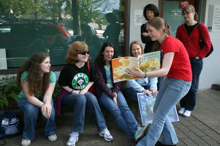 This photo was taken during our senior year roadtrip to Ashland, outside of the youth hostel we stayed in while we were in town to see Measure for Measure with what remained of our girl scout troop 1167 after eleven years together. Sarah is on the far right; she was born with distinctive features, and missed some school every year for the surgeries she needed in order to safely grow into the young woman she became. She had a lot of challenges in life, and I know I only glimpsed the tip of the iceberg of the physical, emotional, and social battles she faced. Sarah had the most radiantly cheerful disposition though, and you never would have known anything was hard or challenging about her life if you were going simply by her attitude.